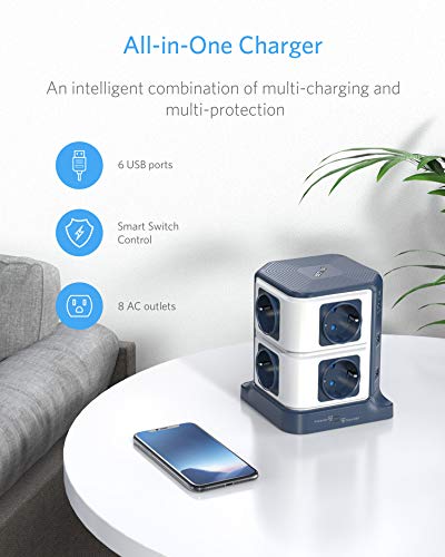 BESTEK Multipresa Ciabatta Elettrica con 8 Prese Schuko e 6 Porte USB, Multipresa Elettrica Verticale con Interruttori Indipendenti(1500J Surge Protezione, 3600W/16A, Cavo 3m)-Blu
