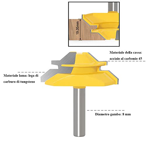 Fresa per tagli obliqui a 45 ° di diametro 8*2,I tagli incrociati a 45 gradi consentono collegamenti estremamente solidi senza difficoltà a mantenere i pannelli in posizione durante il serraggio.