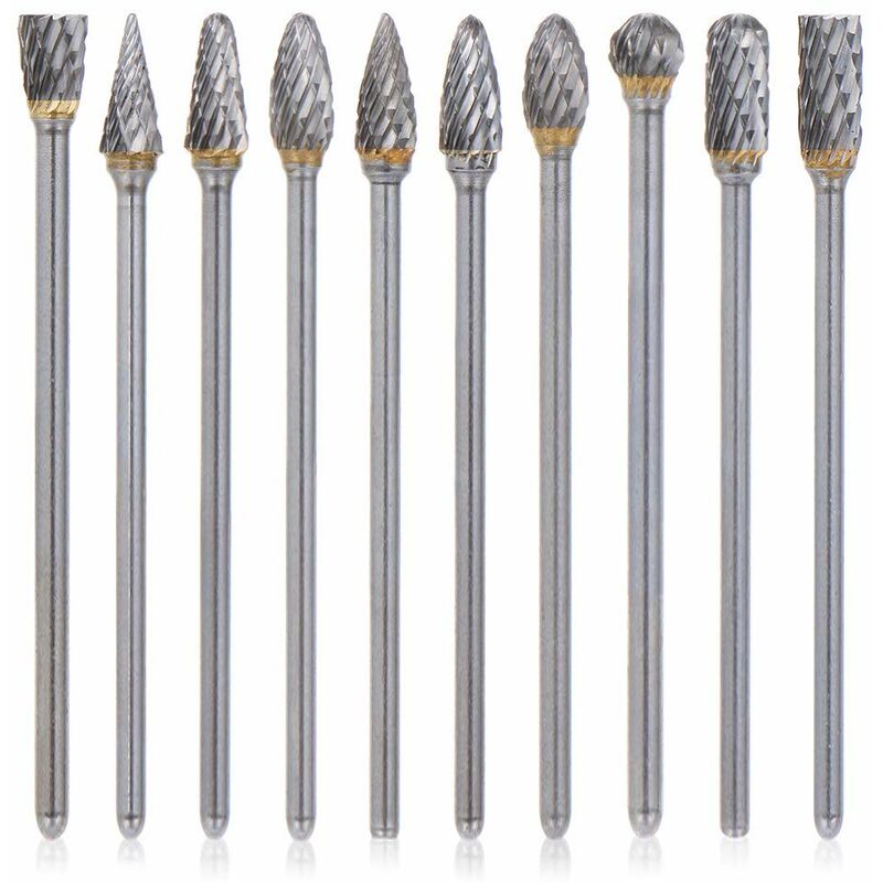Set di 10 pezzi da 3 mm (1/8”), asta doppio taglio in carburo di tungsteno, lime rotanti diamantate. Funzionalità: Asta allungata di 3 mm di diametro, adatta alla maggior parte delle smerigliatrici. Il design a doppio taglio è più adatto alla densità dell'articolo relativamente bassa. Un elevato grado di morbidezza e tutti i tipi di cavità di stampo ad alta precisione possono essere trattate. Ideale per lavori di dettaglio, taglio, incisione, intaglio, ritocco e finitura. Generalmente utilizzato con attrezzi elettrici o pneumatici portatile (può essere utilizzato anche in macchinari strumenti). Specifiche: Diametro dell'attacco: 3 mm (1/8) Diametro del taglio: 6 mm (1/4) Lunghezza totale: 100 mm (4) Materiale: carburo di tungsteno. 10 testine di taglio diverse: ovale, cono invertito, cono appuntito, naso di sfera, naso di sfera, naso di albero appuntito, fiamma, sfera, cilindro a testa rotonda, cilindro con estremità tagliata. Contenuto: 10 x frese in carburo di tungsteno.