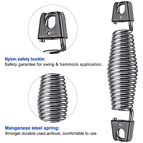 Doppia protezione: ogni estremità della molla girevole ha una parte di fissaggio in plastica, che impedisce di graffiare le dita o le mani durante l'installazione e impedisce alle molle di cadere durante l'uso. Aggiunta di fune di sicurezza nel mezzo, per una maggiore sicurezza durante l'oscillazione nella sedia sospesa.