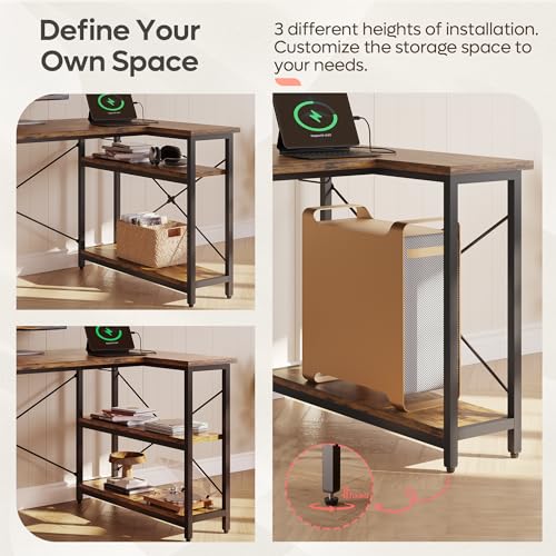 Bestier Scrivania a Forma di L con Prese di Corrente Piccola Scrivania ad Angolo con Ripiani Scrivania per Computer Reversibile da 120 cm con Libreria per Ufficio Domestico Piccolo Spazio