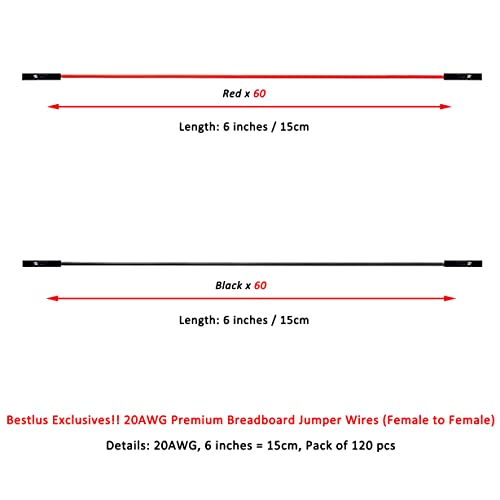 Bestlus - Filo per ponticello da 20 AWG, da femmina a femmina, 15 cm, F/F, confezione da 120 pezzi quadrati, per Arduino Raspberry Pi (15 cm, F/F, rosso, 60 pezzi, nero x 60 pezzi