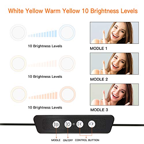 Anello di luce dimmerabile per il trucco: 3 colori modalità di luce: bianco, bianco caldo e giallo caldo. Ogni modalità di illuminazione è progettata con 10 livelli di luminosità e temperatura del colore regolabile da 3000 a 5800 K, basta premere il pulsante per regolare la luminosità e la modalità di luce in base alle proprie esigenze.