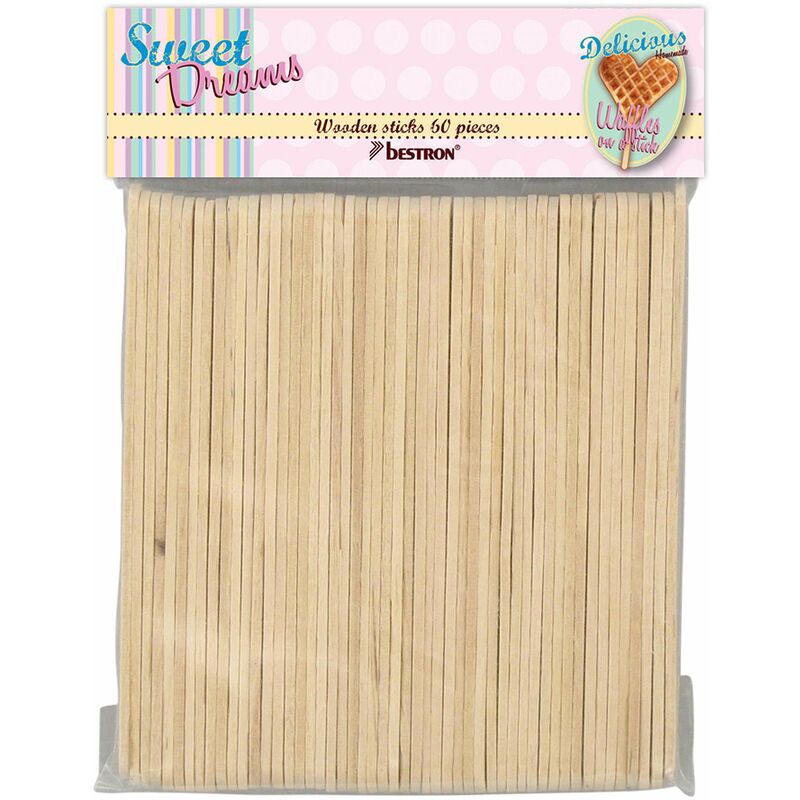 Pratico set con 60 bastoncini di legno per il piacere di assaporare deliziose cialde dolci o salate direttamente su stecco - Ideale per feste o compleanni di bambini - Facili da tenere in mano per decorare, servire o mangiare cialde appena sfornate grazie alle dimensioni maneggevoli (14 cm di lunghezza, 1 cm di larghezza) - Supplemento agli stampi per cialde a forma di cuore (DSW271P, DSW271) della serie di design Sweet Dreams in stile retro - Materiale: legno naturale per uso alimentare, Resistenti ai morsi e privi di schegge per un divertimento in sicurezza - Contenuto: 2 Bestron Set di bastoncini di legno (60 stecchi ciascuno), Materiale: Legno, Dimensioni di ciascun bastoncino: 14 cm lunghezza, 1 cm larghezza, DST60
