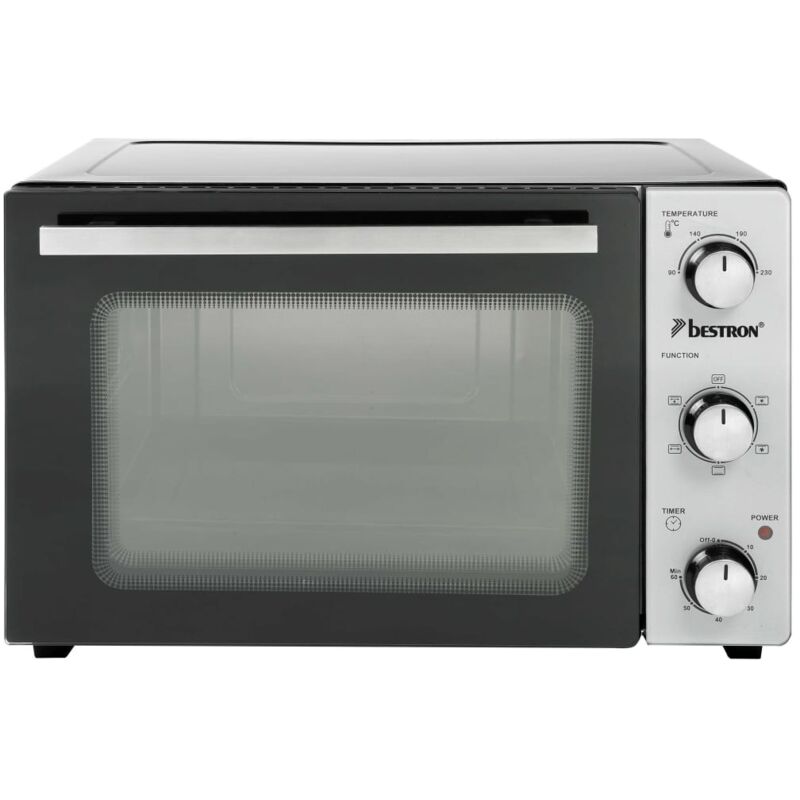 Il forno e grill AOV31 della Bestron, con una potenza di 1500 W, la temperatura regolabile fino a 230 °C e una funzione per far circolazione aria calda, è un forno elettrico affidabile e anche un pratico girarrosto perfetto per carne e pollame, ideale per tostare, cuocere al forno e grigliare deliziosi piatti in pochissimo tempo! La funzione girarrosto è molto utile per preparare un delizioso pollo croccante in casa. Questo forno a convezione della Bestron ha 3 diverse impostazioni di altezza dove poter mettere la griglia e funziona in base a 4 elementi riscaldanti, che forniscono un riscaldamento uniforme sia superiore e inferiore. L' involucro termoresistente è dotato di un pannello di controllo in acciaio inossidabile e di un quadrante per selezionare il riscaldamento superiore o inferiore. Il timer da 60 minuti, con allarme, è molto utile quando si è impegnati con altri compiti in cucina, mentre la porta del forno a doppia parete e la maniglia resistente al calore consentono di