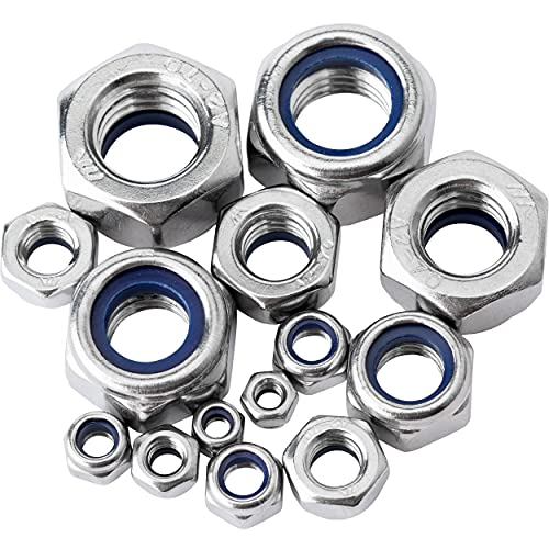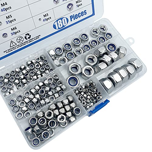 BESTYCHAO 180 pezzi Dadi di bloccaggio in nylon Kit di assortimento di dadi esagonali con inserti in acciaio inossidabile, dadi di bloccaggio autobloccanti M3 M4 M5 M6 M8 M10 M12