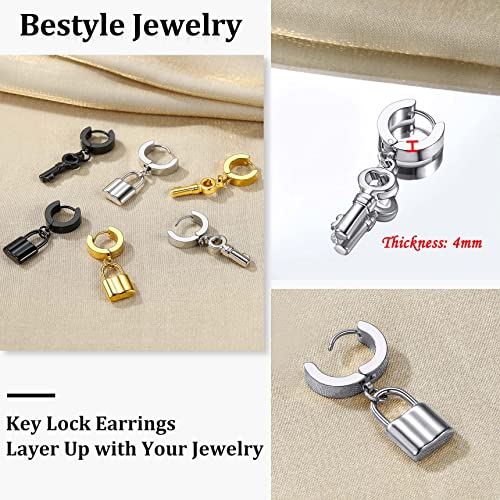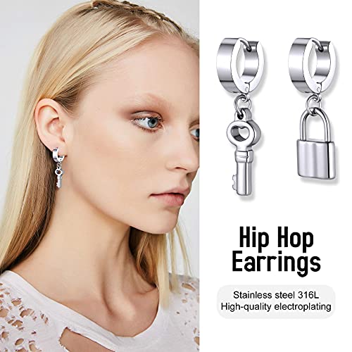 Bestyle Orecchini Cerchio con Pendente Acciaio Orecchini Lucchetto e Chiave Argento Orecchini Asimmetrici Donna in Acciaio Inox Unisex con Confezione Regalo