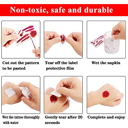 【Ampiamente utilizzata】 Questi spaventosi tatuaggi sanguinanti sono adatti per la festa di Halloween, le feste a tema, il giorno degli sciocchi, il carnevale, la festa in costume, i servizi fotografici, le serate in discoteca, i progetti di arti e mestieri, i festival o gli effetti speciali dei programmi TV, lo scherzo quotidiano ecc. La scelta migliore per un gioco spaventoso o un cosplay cinematografico.