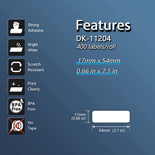 [ Specificazione ]: 17mm x 54mm(0.66 x 2.1 in)(Larghezza x lunghezza) - Nero su Bianco, 10 Rotoli & 4000 Etichette(400 Etichette/Rotolo) - Compatibile con Brother DK-11204 Pre-taglio Etichette Multiuso