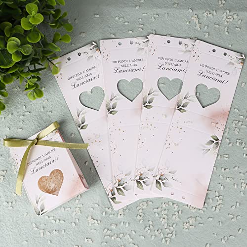 Il pacchetto include: 50pz scatoline portariso matrimonio, 100pz sacchetti plastica e nastro verde.