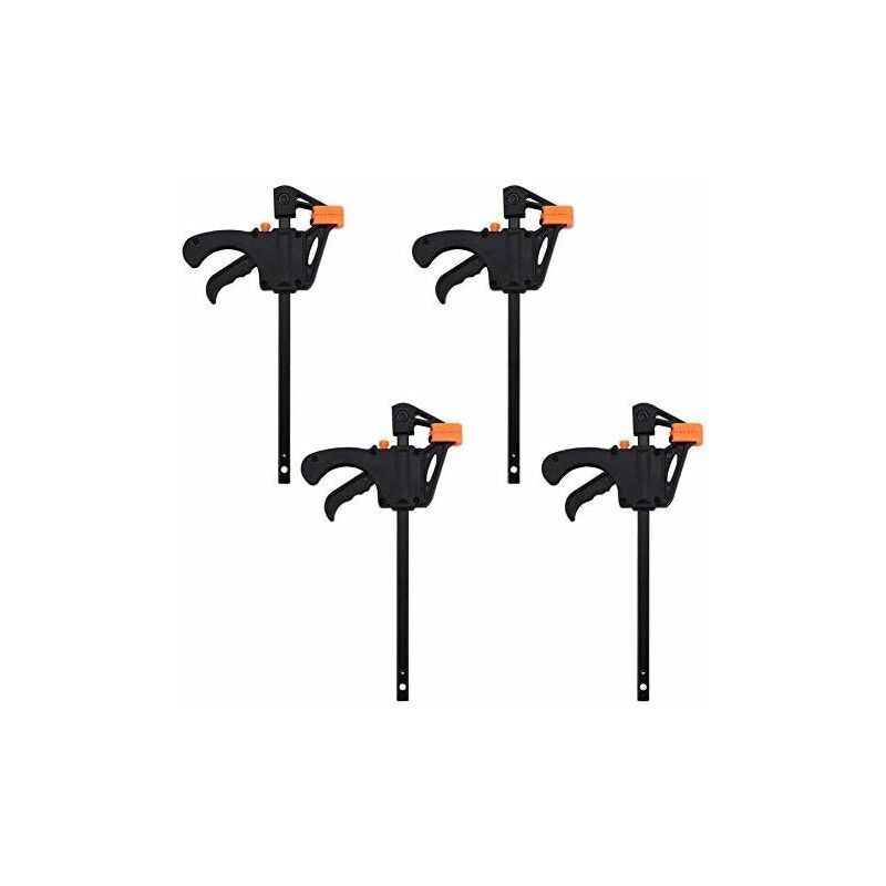 Clip con morsetto a molla - La parte arancione della clip è seghettata all'interno, fissa l'oggetto in modo migliore e più sicuro. Le clip a molla di alta qualità offrono una presa buona e robusta. Pinze Il manico curvo con motivi antiscivolo è comodo. Materiale di alta qualità: le pinze a cricchetto e la clip a molla sono realizzate in nylon e acciaio al carbonio, che sono resistenti, veloci e facili da usare e leggero. Design ergonomico - Può essere utilizzato con una mano, l'impugnatura può contenere comodamente le pinze durante il processo di serraggio e ha un'area antiscivolo che fornisce anche forza di presa. morsetto fermo che può essere rapidamente e rilasciato in sicurezza con una mano Apri la F. Morsetti a sgancio rapido - Il morsetto è facile e senza problemi da rilasciare con un grilletto con una sola mano e il pulsante di sgancio rapido può essere premuto per far scorrere il braccio verso lunghezza desiderata e fissa il legno in posizione. Pacchetto Come usare - 4