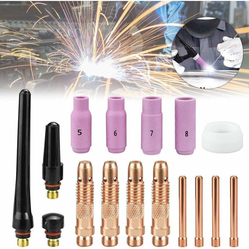 16 pezzi Accessori torcia TIG: Questo kit include 4 coppe in ceramica per ugelli in allumina TIG, 4 morsetti TIG 4 corpi morsetto TIG, 3 cappucci posteriori TIG e 1 coppa di guarnizione isolante posteriore inserita. Un set completo di parti della torcia di saldatura ti evita di acquistarle una per una. Parti di ricambio di WP-17/18/26: Il kit di materiali di consumo TIG Tig è un pezzo di ricambio della torcia per saldatura TIG WP-17/18/26. Applicabile a macchine come Rilon, Riland, Jasic, Mitech, Chiry, UNT, Krypton, Longetivity, Berlan e così via. Questo kit è adatto a tutte le torce per saldatura raffreddate ad aria della serie 17 26 e alle torce per saldatura ad acqua della serie 18, Lincoln PTA-17 PTA-17V PTA-26 PTA-26V PTW- Torce per saldatura Tig 18. Fornire buone prestazioni di saldatura: Consumabili TIG Il kit TIG è realizzato in materiale di alta qualità, resistente e resistente alle alte temperature, durevole. Il kit TIG consumabili Tig è conveniente per sostituire quello
