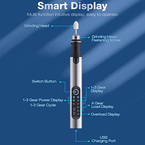 Buone prestazioni: penna per incisione in metallo dotata di un motore eccellente, la potenza di lavoro è di 10 W. Regolazione a 3 velocità 5000‑18000 RPM, adatta a diversi luoghi. La velocità minima consente di lucidare le unghie in sicurezza, la velocità massima può essere utilizzata anche per l'incisione dei metalli