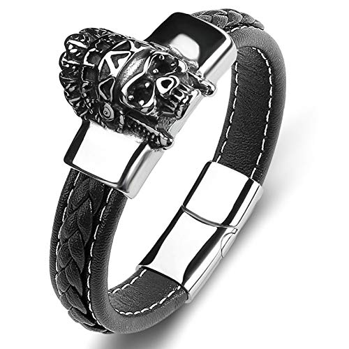 Beydodo Bracciale in Pelle Intrecciata Uomo, Braccialetto in Cuoio Uomo 16cm - Bracciale Gotico Uomo A Forma di Teschio Capo Indiano