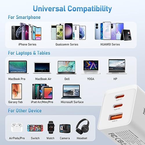 【Compatibilità Ultra-Ampia】Il alimentatore usb c PD 67W è compatibile con la maggior parte dei dispositivi USB-A e USB-C, tra cui Macbook Pro/Air, iPhone 14/13, iPad Pro/Air, Galaxy S23/S22/S21/Ultra/Plus/Note/A54, Google Pixel, Dell, Switch, Steam Deck e altri. (Cavo di ricarica USB-C incluso-100W)