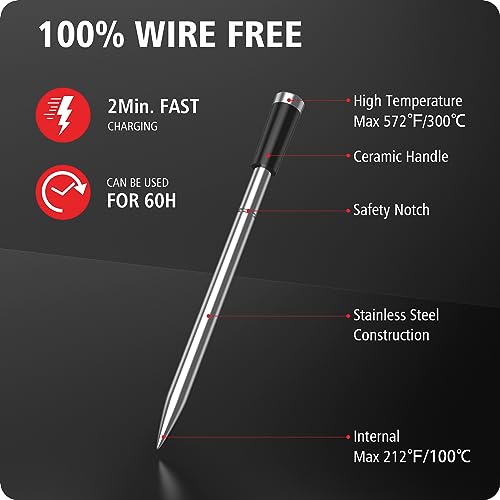 DUE SENZA PRECISIONI: il nostro termometro wireless per carne dispone di due sonde che possono misurare temperature interne fino a 212°F/100℃. Inoltre, la maniglia in ceramica può registrare temperature fino a 300°F. Si prega di notare che questo dispositivo non può misurare la temperatura ambiente.