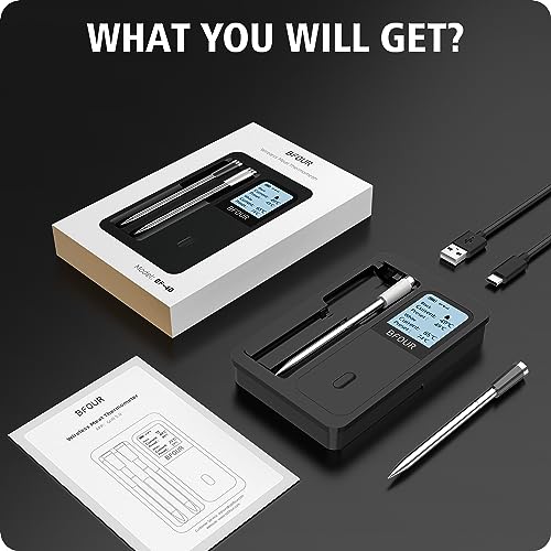 BFOUR Termometro per carne senza fili con 2 sonde, termometro per carne Bluetooth con ampio display LCD, batteria ricaricabile, impermeabile IP67