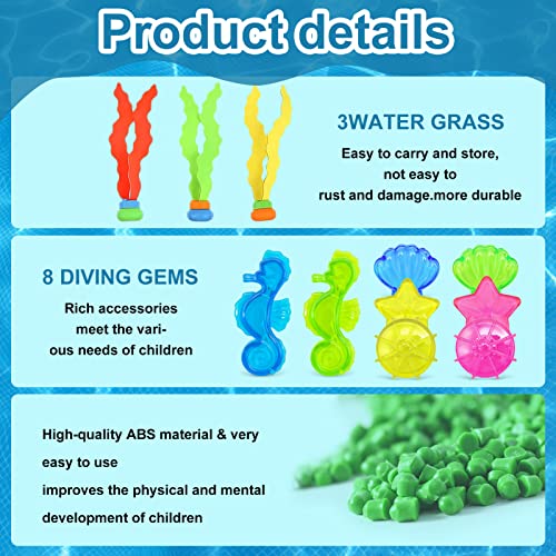 【Set da giocattolo subacqueo】Riceverai 3 giocattoli per immersione, 8 gemma immersioni. Una varietà di accessori soddisfa le diverse esigenze dei bambini. I colori vivaci consentono ai bambini di trovare facilmente il giocattolo subacqueo in acqua.