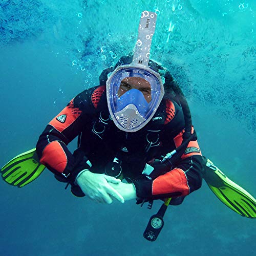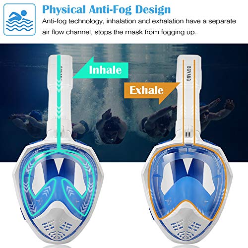 BGVANG - Maschera integrale da snorkeling con visuale panoramica a 180°, anti-appannamento, anti-perdite, con supporto per fotocamera rimovibile, Blue, S/M