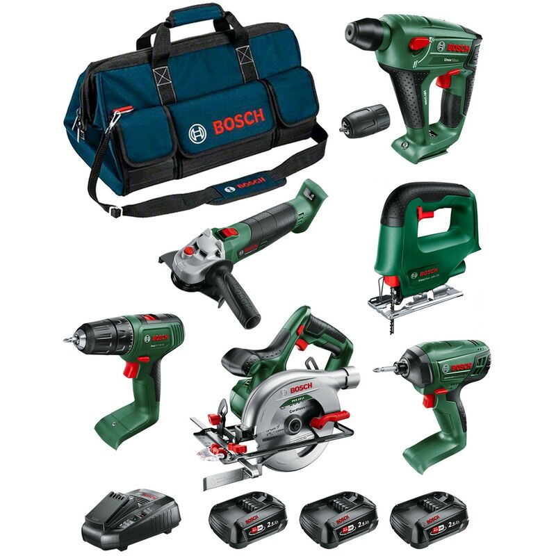 BOSCH HG Kit BHGK600 Martello Perforatore BOSCH HG Uneo Maxx 18 LI - Potente e compatto, il Martello Perforatore a batteria Uneo Maxx è progettato per le attività più complesse di martellatura, foratura e avvitatura su calcestruzzo, muratura, metallo, legno e piastrelle - Il meccanismo a percussione Bosch insieme al potente motore consentono una perforazione rapida e semplice nel calcestruzzo fino a una profondità di 10 mm - Dispone di un mandrino SDS per un funzionamento intuitivo e un rapido cambio di tutti i bit esadecimali da 1/4 e i bit SDS in 3 secondi - Questa centrale elettrica da 1,4 kg si comporta come un pesce nell'acqua in spazi ristretti ed è in grado di affrontare qualsiasi progetto con facilità - POWER FOR ALL: una batteria ed un caricabatterie per un'intera gamma di utensili Home & Garden Smerigliatrice BOSCH HG AdvancedGrind 18 - Libertà senza fili e maneggevolezza ottimale per varie attività fai-da-te - Il potente motore e la preselezione del numero di giri offrono