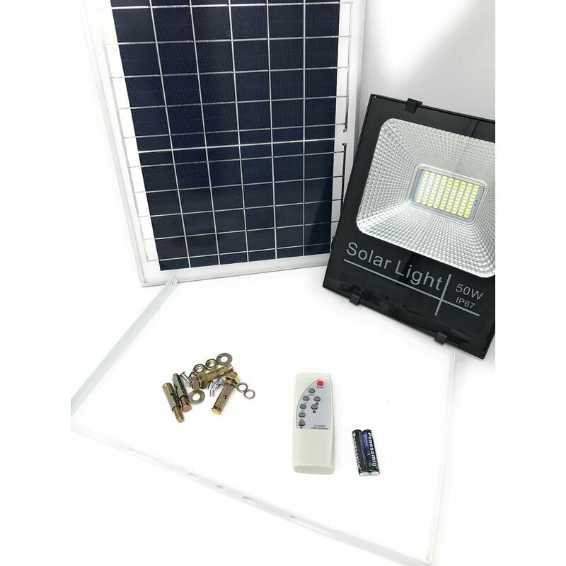 Faro a led da 50W ricaricabile ad energia solare completo di pannello solare e batteria ricaricabile integrata nel faretto, è dotato di LED SMD bianco light, inoltre c'è anche un sensore crepuscolare integrato nel pannello solare per l'accensione automatica al calare della luce. Questo prodotto viene fornito con istruzioni in Inglese, l'estetica ed il colore del faro, del pannello, della staffa e del possono variare in base alla disponibilità di magazzino, le dimensioni del faro e del pannello variano in base alla disponibilità di magazzino, la lunghezza del cavo del faro è di circa 15 cm mentre quella del cavo del pannello è di circa 400 cm, infine è incluso all'interno della confezione sia il telecomando nel caso si voglia comandare manualmente lo spegnimento e l'accensione del faretto che una staffa per il fissaggio del faro.