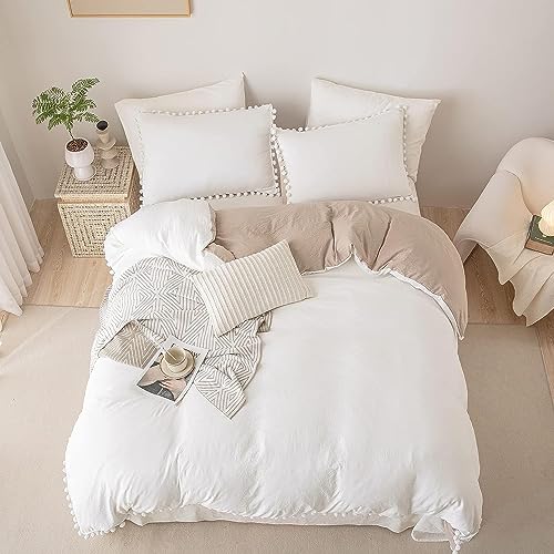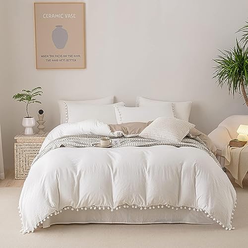 Set di biancheria da letto con copripiumino con pompon e nappe, 3 pezzi, in cotone lavato naturale, ultra colorato, stile moderno, copripiumino con cerniera (A1, matrimoniale, 200 x 200/50 x 75 cm)