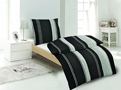 2tlg Set di biancheria da letto in microfibra seersucker strisce nero argento nuovo con RV 155 X 220 + 80 X 80