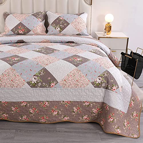 Set di biancheria da letto trapuntata per letto matrimoniale, con motivo patchwork, 3 pezzi, 220 x 240 cm, reversibile, motivo floreale, trapuntato, con 2 federe (marrone)