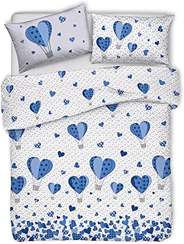 Biancheriastore Copripiumino Cuori e Mongolfiere | Set Sacco Copri Piumino + Federe | Made in Italy| Copripiumone Moderno 100% Cotone - 1 Piazza e Mezza - Blu
