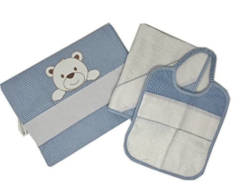 Biancheriastore New style at home Set Asilo Tre Pezzi Ricamabile, Composto da Bavaglino con Elastico, Asciugamano, Sacchetto per Il Cambio - Azzurro
