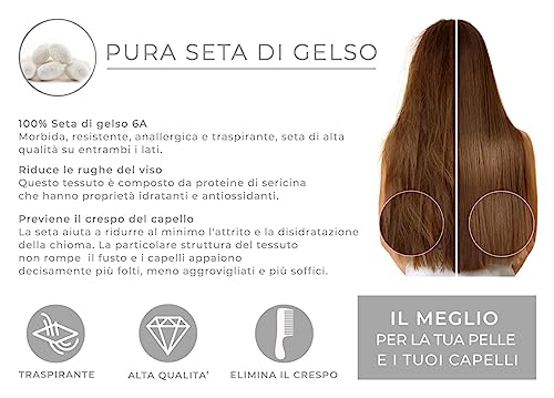 BENEFICI PELLE/CAPELLI - Il Tessuto Della Federa Seta Cuscino Letto È Composto Da Proteine Di Sericina Che Mantiene La Pelle Liscia Rallentando Il Ruolo Dell'Invecchiamento e La Comparsa Di Rughe. Le Federe Di Seta Sono Perfette Per Prevenire Anche Il Crespo Dei Capelli e Ridurre Al Minimo L'Attrito e La Disidratazione Del Capello e Rinforzare Il Cuoio Capelluto. La Particolare Struttura Del Tessuto Non Rompe Il Fusto E I Capelli Appaiono Decisamente Più Folti,Meno Aggrovigliati E Più Soffici