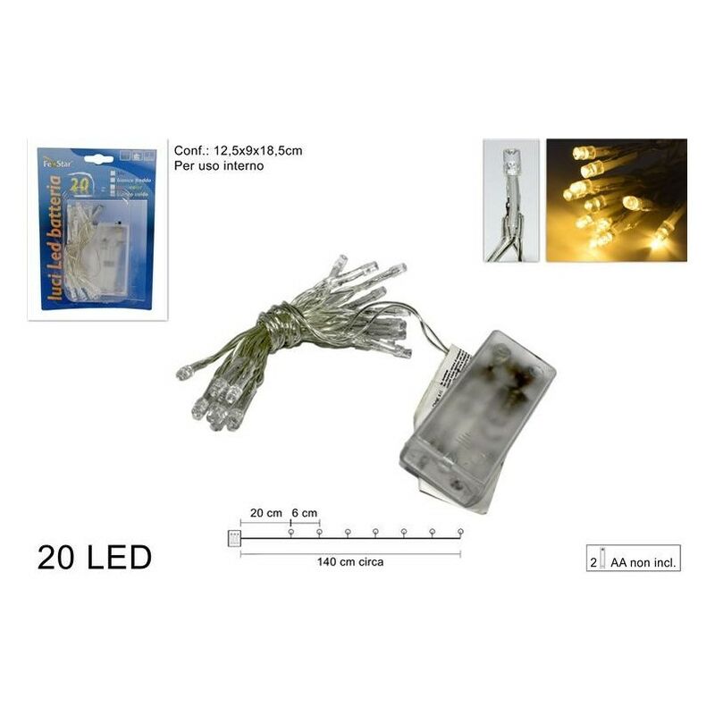 Catena di 20 luci a led colore bianco caldo, funzionante a batteria (2 batterie AA non incluse). Per uso interno. Lunghezza cavo: 140 cm. Distanza tra le luci: 6 cm. Ideale per decorare la tua casa durante il periodo natalizio.
