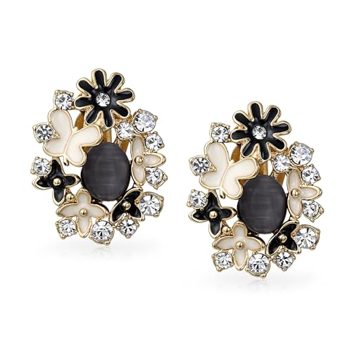 Un giardino di delizie primaverili per orecchie non forate. Questi eterei orecchini a clip in ottone placcato oro presentano al centro una perla nera simulante un occhio di gatto, con motivi di farfalle e fiori e accenti di cristallo in un design femminile.