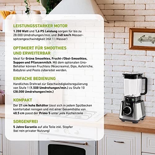 Potente: 28000 giri al minuto e 1200 Watt - > sminuzza facilmente i semi di avocado.
