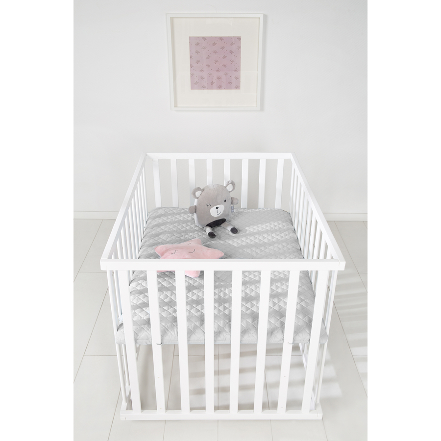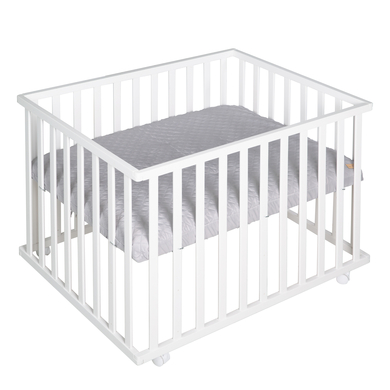Box per bambini in legno naturale. Box rettangolare con abbastanza spazio per giocare, 75 x 100 cm, e un inserto morbido. La possibilità di regolare il fondo con 3 altezza diverse, favorisce la schiena e invita i genitori a giocare con i loro piccoli. Con rotelle per semplificare gli spostamenti. Un posto sicuro in cui i bambini potranno scoprire, crescere ed imparare. Dettagli del prodotto: Box per bambini Colore: bianco Materiale superficie di riposo: MDF Materiale struttura: compensato, laccato Dimensioni: Ampiezza x Lunghezza x Altezza 100 x 72,5 x 75 cm Con barre piatte Regolabile in 3 altezze Set 4 ruote con freni Portata fino a 15 kg Rivestimento Colore: grigio Materiale dell'imbottitura: 65% poliestere, 35% cotone Materiale imbottitura: Poliestere Inclusi nella spedizione: Box per bambini Ruote con freni Rivestimento