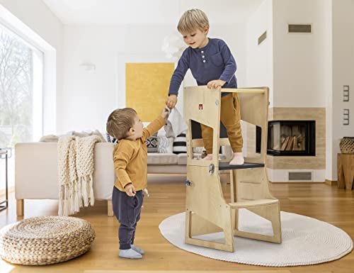 REGOLABILE IN ALTEZZA: Siamo fieri di essere l'unica Learning Tower Trasformabile al mondo con regolazione in altezza. Con ben tre livelli di regolazione, la TRANSFORMER REGOLABILE crescerà insieme al tuo bambino, accompagnandolo nei diversi stadi della sua crescita e sviluppo. Questa caratteristica unica rende la torre un investimento a lungo termine, adattabile alle esigenze dei bambini di diverse età, permettendo loro di sperimentare il mondo da una prospettiva sempre più ampia.