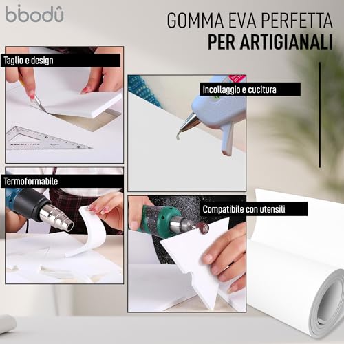 BIBODU Pacco 2 Rotoli di Gomma Eva Bianca 2mm di Spessore | Dimensioni Fogli 150cm x 32cm, Densità 80 kg/m3 | Eva Foam Bianco per Creazioni DIY, Foam Cosplay, Halloween | Adatto Bambini