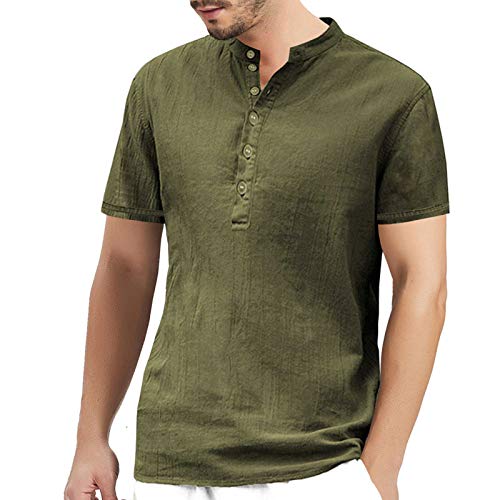 BIBOKAOKE - Camicia da uomo a maniche lunghe o corte, in tinta unita, effetto lino, adatta per il tempo libero, vestibilità normale, con bottoni, Verde 11., L