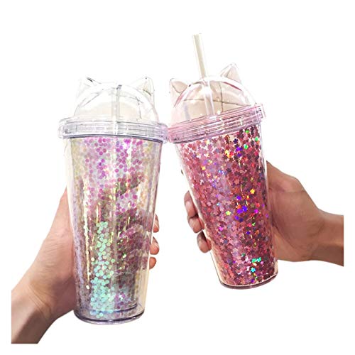 Bicchiere con Cannuccia Carino gatto orecchio flash film doppio strato tazza da 420 ml regalo tazza di custom tazza di plastica creativa tazza di acqua di acqua di plastica 7.87 * 3.74 * 3.74inches