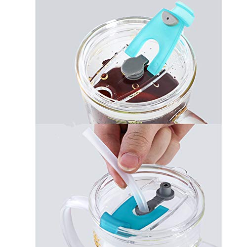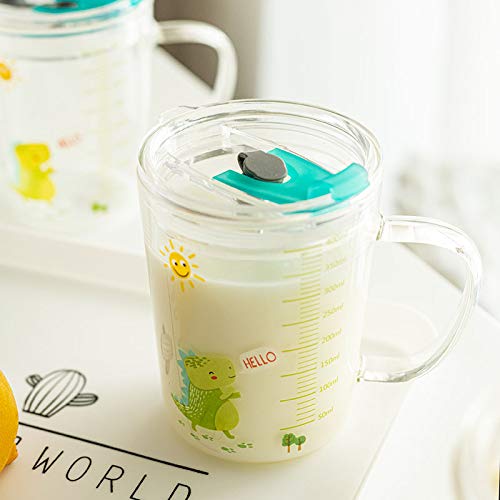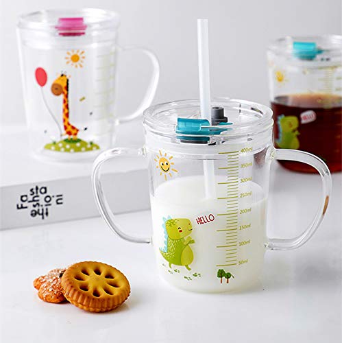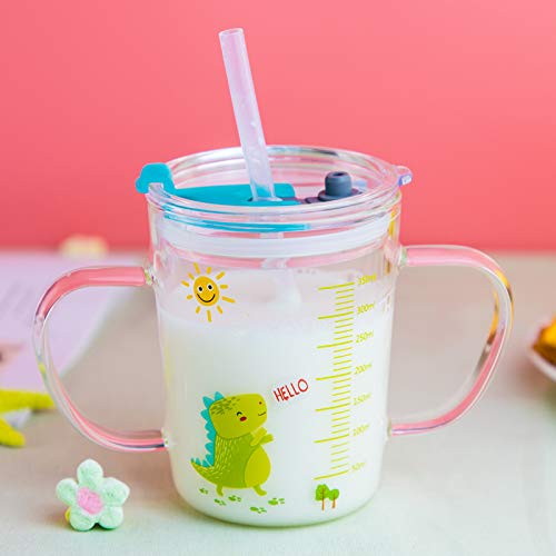 Bicchiere dosatore in vetro borosilicato resistente al calore, per bambini, con doppio manico, con coperchio e cannuccia in silicone, per microonde, succo di latte, tè ghiacciato, caffè