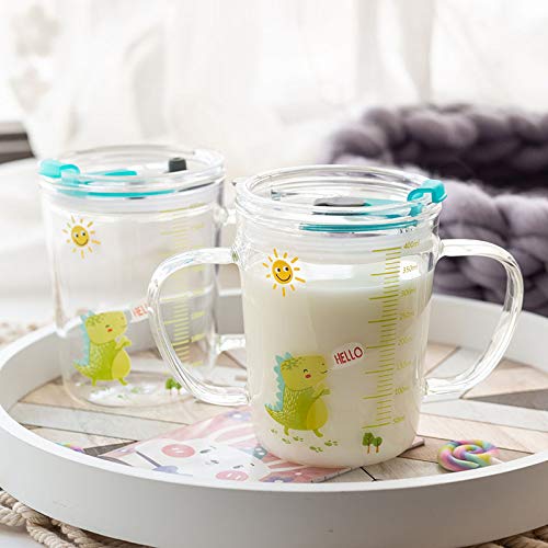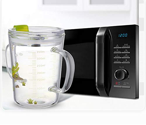 Vetro borosilicato di alta qualità: la tazza da latte per bambini è resistente agli urti e alle cadute, può essere refrigerata e riscaldata nel forno a microonde. Con design a doppio manico, la presa è comoda e non cade facilmente. Nota: il coperchio della tazza non è resistente alle alte temperature e non può essere messo in forno a microonde.
