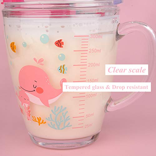 Bicchiere da latte in vetro con misura, misurino con coperchio e cannuccia in silicone per bambini, 350 ml, resistente al calore, in vetro temperato per microonde, succo di latte