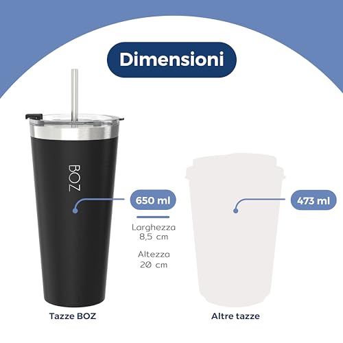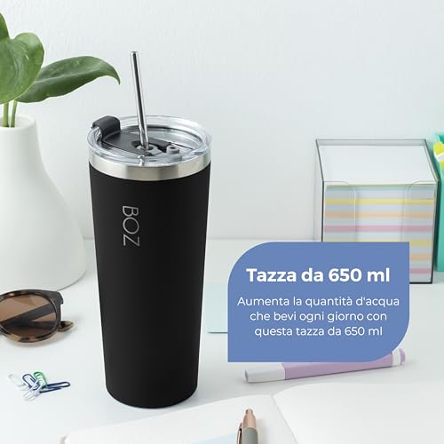 BOZ Bicchiere Termico con Cannuccia e Coperchio (650 ml, Nero) - Tazza con Cannuccia per Bevande Calde e Fredde in Acciaio Inossidabile - Bicchiere con Cannuccia Adulti Senza BPA