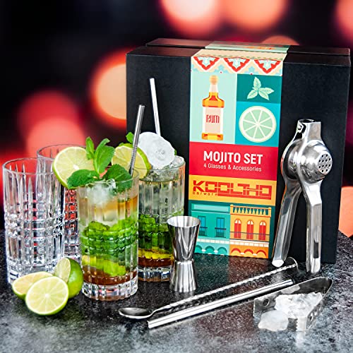 VUOI GUSTARTI DEI MOJITO DELIZIOSI? Il set mojito cocktail di KOOLTHO dispone di tutti gli accessori per mojito di cui hai bisogno: 4 bicchieri mojito particolari grande 400ml (non cristallo), misurino per cocktail graduato cl, bar spoon barman, spremi lime e limone, pinze ghiaccio acciaio inox, 4 cannucce metallo cocktail riutilizzabili