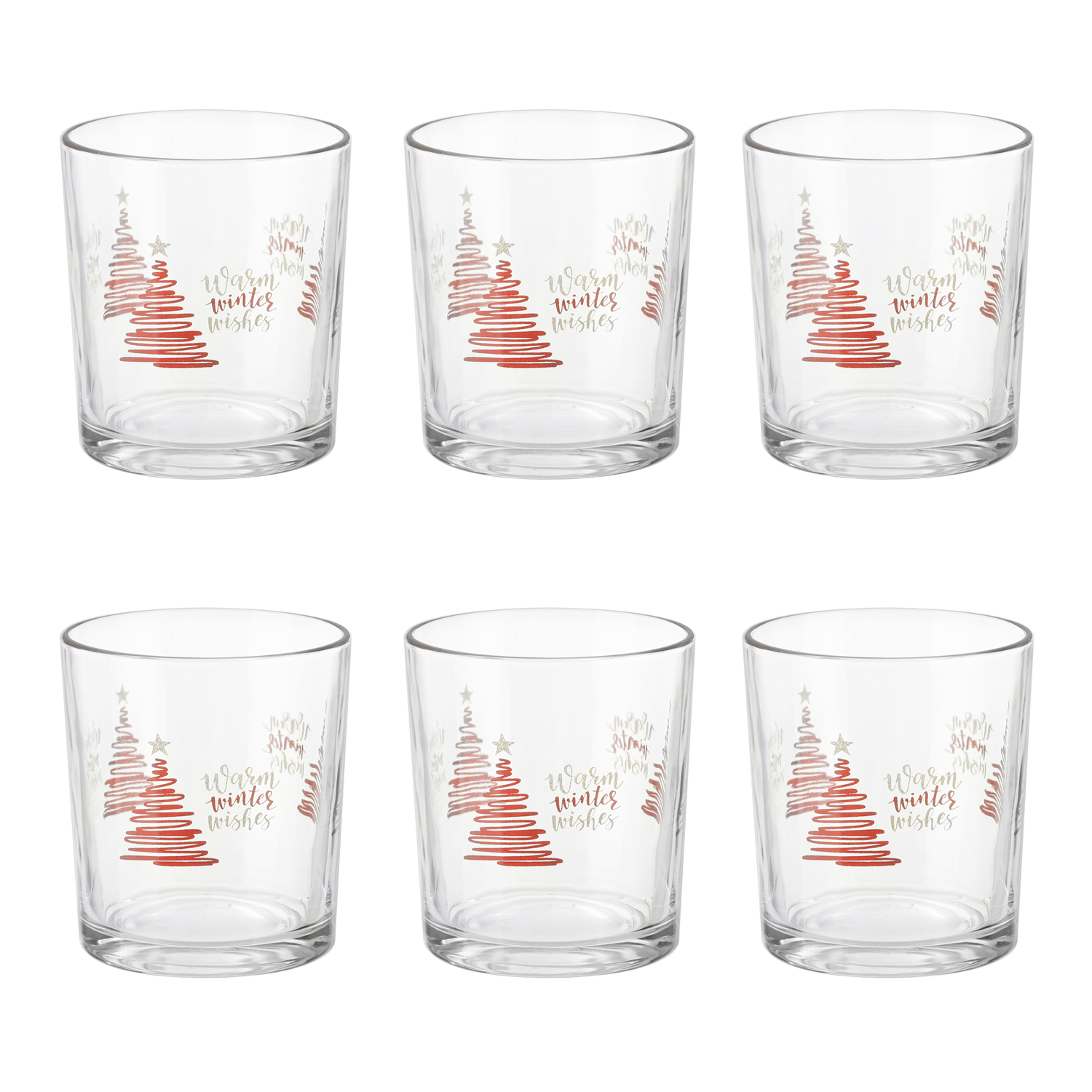 Completa la tua tavola delle feste con questo servizio di bicchieri natalizi in vetro trasparente. Ogni bicchiere acqua del set è impreziosito da decori con alberi stilizzati di Natale e scritta Warm winter wishes. Il servizio è adatto per apparecchiare la tavola per 6 persone con colore e allegria, gustando acqua e altre bibite. I bicchieri hanno diametro 7,7 cm, capacità 265 ml e sono lavabili in lavastoviglie.