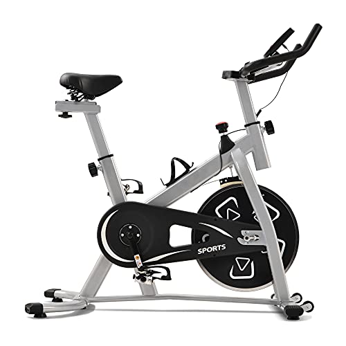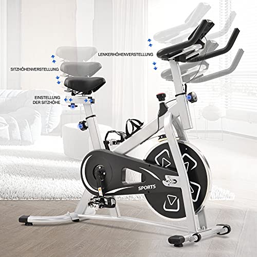 Bicicletta Cyclette Indoor Spinning Bike con Sedile Regolabili, Schermo a LED, Supporto a Portata di Mano,Sensore di Impulso, Bici da Fitness Ergonomica, Carico Massimo 150 Kg (Bianco + Metallo)