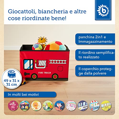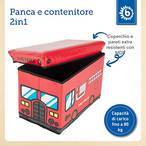 CONTENUTO DELLA CONFEZIONE: 1 contenitore giochi bambini e panca rosso. Design: vigili del fuoco;