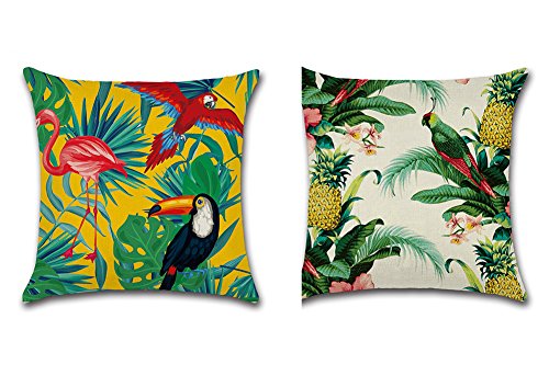 BIGBOBA, federa per cuscino, motivo: pianta tropicale di colore verde, con uccellino e pappagallo decorativi, per letto o divano, in lino, federa per cuscino da 45 x 45 cm