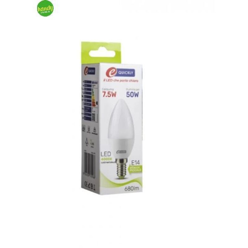 Lampadina Led prodotto dal brand E-Quickly. Lampadina con attacco E14, conpotenza di 7,5W può generare 680 lumen, luce bianca naturale perfetta 4000K, l'efficienza della luce è uniforme e omogenea. La lampadina corrisponde ad una lampadina a incandescenza convenzionale da 50 W.La confezione contiene una lampadina.