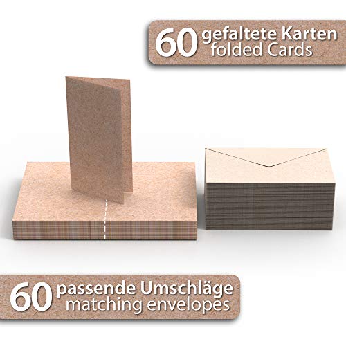 Per ogni occasione: 60 biglietti doppi in formato A6 e 60 buste abbinate. La carta di carta kraft giusta per molte occasioni: biglietti di auguri fai da te, per auguri di Natale, compleanni, matrimoni, feste, festività, eventi aziendali, inviti.